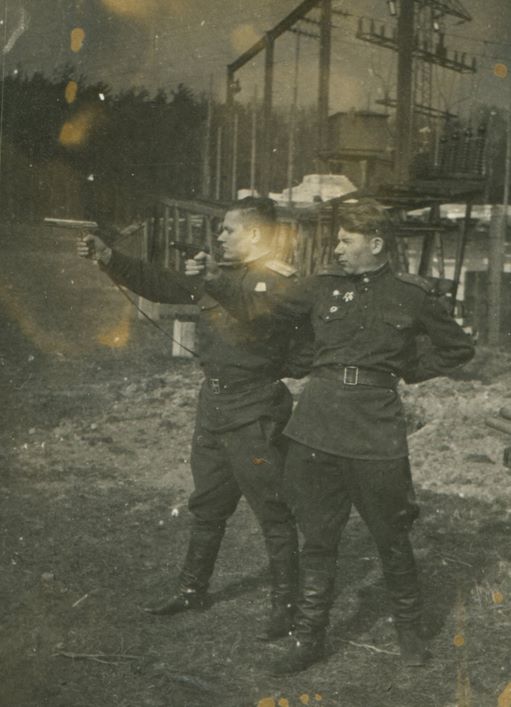 En esta imagen histórica se ve a diversos soldados soviéticos sobre la famosa Puerta de Brandemburgo disparando al aire para celebrar la caída de Berlin con subfusiles soviéticos PPSh-41 y PPS-43 y pistolas de uso alemán P.38, C96, P.08 y Radom Vis 35.