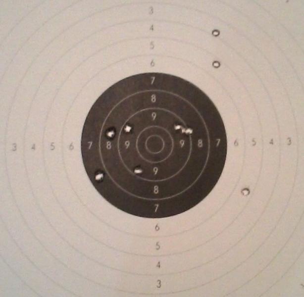 Este domingo realice un prueba con carga picante y bola., 70gn de 2ff , y estos son los resultados a cien metros. Despues de cuatro negros, 7, 8 y dos 9, tres tiros seguidos en el blanco a la derecha ??????......y despues otro nueve y el que esta en la linea ocho-nueve. No se exactamente el motivo del desfase de esos tres tiros seguidos en el blanco aunque pienso que tal vez podria ser que el orificio del culatin se obstruyese parcialmente por residuos y no llegase correctamente la llama del piston pues ya llevaba bastantes tiros con la minie y maxibala y el cultin no lo habia limpiado. Misterios de la avancarga.
