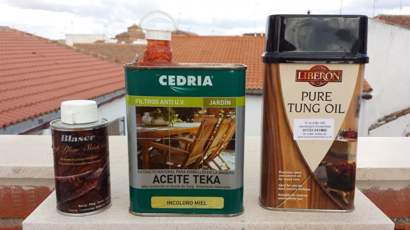 Otro que e utilizado es el de Xylazel tung oil,y otro aceite que es muy bueno,es el de la marca Mora,en satinado,todos estos los puedes encontrar en ferreterias y almacenes o tiendas de bricolage,y en armerias podras encontrar el aceite blaser para culatas,pero como te dije es caro,pero el acabado es profesional.
