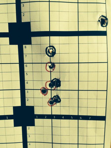 Esta foto tiene dos series la 3 y la 4 la de los impactos rojos q son 4 tiros y los impactos con una cruz negra. Los círculos negros son de una Rn de 180 q recargo con 56 gr de t7000 que no me disgusta.