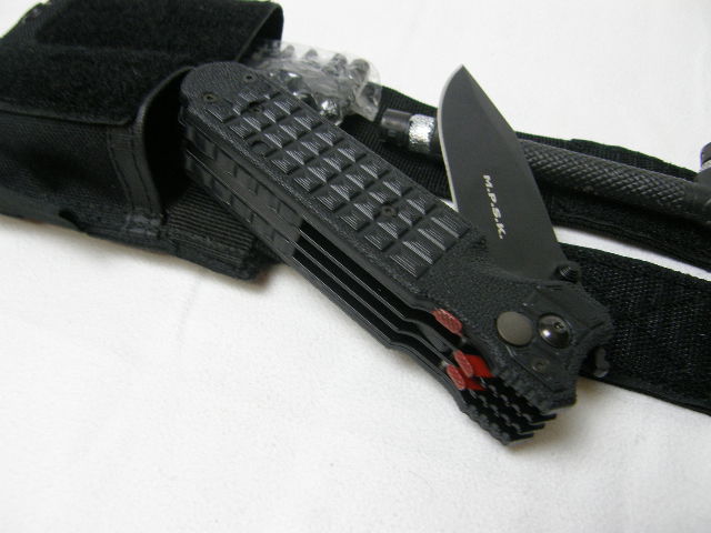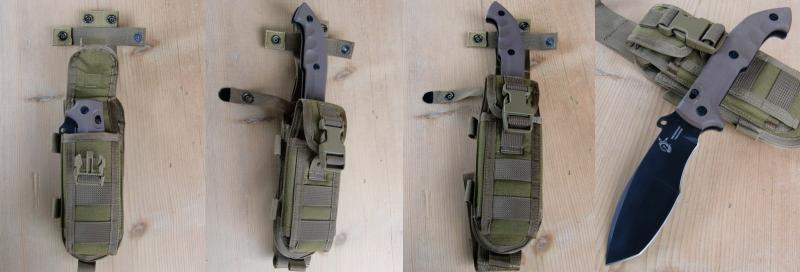 Funda de Nylon 1000D con dos opciones; una de llevar la navaja abierta como un cuchillo y otra funda desmontable superior que permite portar la navaja plegada.SISTEMA MOLLE.