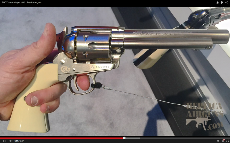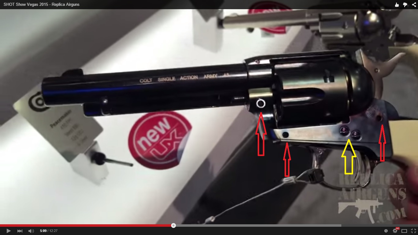 si os fijais bien en el video vereis, los tres tornillos que marco de rojo, que delatan que no es una replica de metal, con la flecha amarilla señalo los tornillos que en un catleman son reales y en este se ven que estan hechos con un molde, son falsos, esta replica es zinz o plastico, tambien lo delata el sonido, nada que ver con el catleman de ME que en realidad no esta fabricado por ME si no por WEIHRAUCH y utiliza el mismo revolver para fogueo, bacs y municion real, cada uno le adapta las recamaras y el interior del cañon al calibre pero el arma en si es la misma.