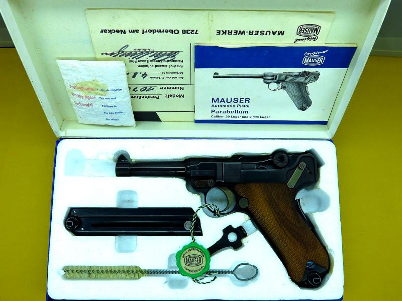 Luger Mauser 06/73 9 para. en estado nuevo con todos los complementos, caja, libro de instrucciones, baqueta, dos cargadores y herramienta de carga.Se vende a titular de Libro de Coleccionista o para guiar en F, A y B.