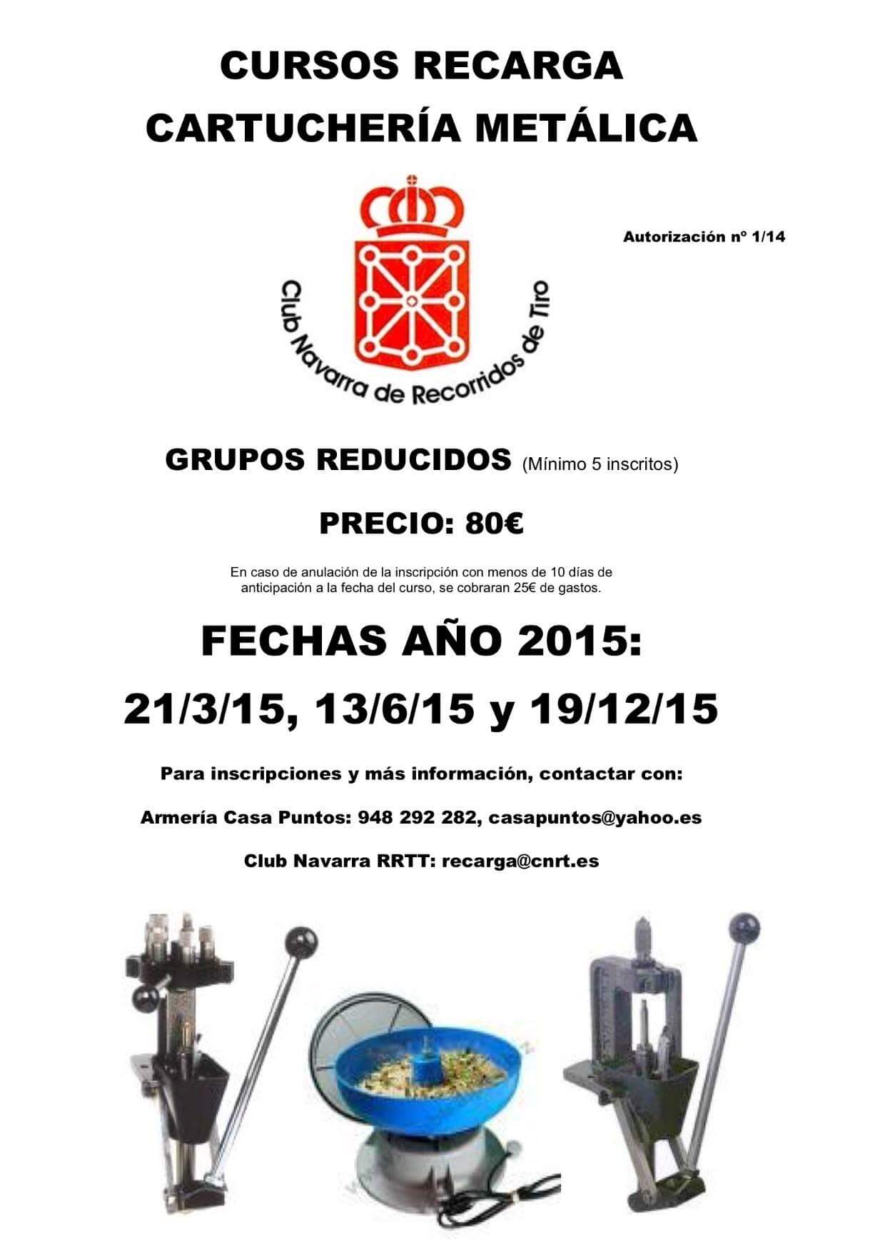 La Federación de Caza de Murcia organiza un curso de recarga , no hay fecha , cuando haya diez o doce alumnos máximo se impartirá , el precio 80 € con la documentación , para mas información , el teléfono de la Federación es el 968 284248