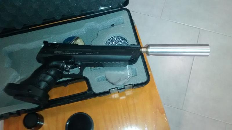 Decidí indagar y descubrí que el cañón viene roscado en su boca, por lo que he podido hacerme un silenciador que he probado antes de cenar.... Es una gozada, el precomprimido silenciado resulta adictivo.