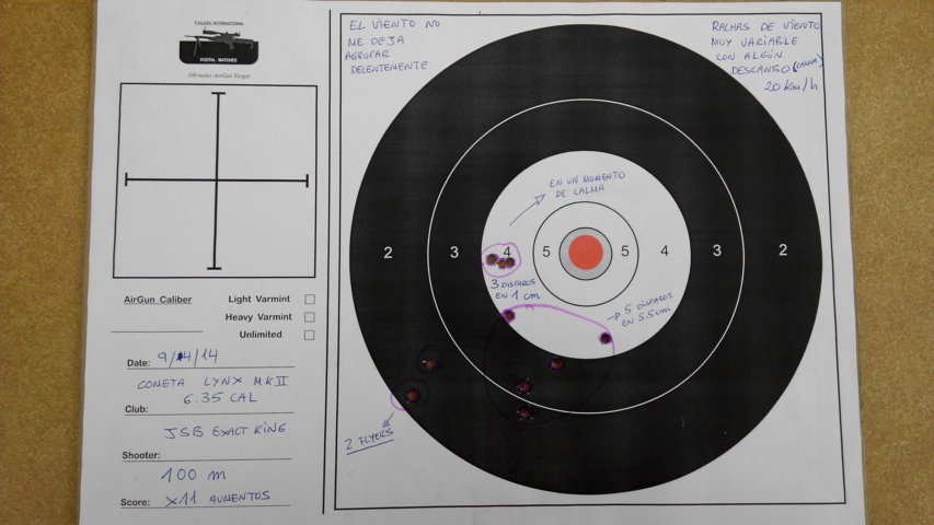 hola . excelentes agrupaciones ! , mas teniendo en cuenta el visor de 11 aumentos , ( yo con esos aumentos y a esa distancia , no veo la diana ) y el calibre , con que potencia estan hechas ? . cometa a dado sus problemas , al igual que hay quien dice maravilllas , hay quien hecha pestes de ella ! , baratas no son ! , fuera aparte , si lo del aire comprimido no tiene mas exito , es porque permitieron que se regulara y legislara tan restrictivamente sobre su uso y eso va a acabar con las carabinas " baratas " , algun dia la gente se cansara de comprar una y hecharla encima del armario , porque lo de tirar cada dia esta mas complicado , excepto para los federados y asociados siempre que un club les quede cerca ! . lo de los productos alemanes sera como lo de seat y wv , etc ... es que cada cual con su dinero , compra lo que le apetece . suerte !!!