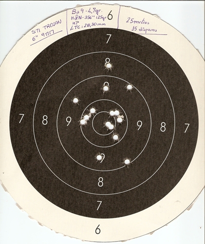 Con la punta H&N high speed de 125 gr 356" HP, es para mi la mejor punta que he probado hasta la fecha, por calidad de acabado, coges un puñado de puntas y todas el mismo largo y peso, es increible. Para la STI Trojan de 6", le meto 4,6gr. de verano y 4,8gr. en el invierno, ya que aqui en Asturias hay mucha humedad y se nota de Ba9, con OA, 4,1-4,2 gr. mas o menos para todo el año. El LTC lo pongo a 28,20mm siempre hablando de la STI la tabla de H&N por ejemplo para la sig p210 es de 27,65 mm. Yo jugaria con esos margenes para todas las armas que he probado y han sido unas cuantas, pardini, s&w, HK, STI, SPS, SIG sauer,HK p9, etc, y funciona en todas agrupando, repito para mi es la mejor punta que he probado.