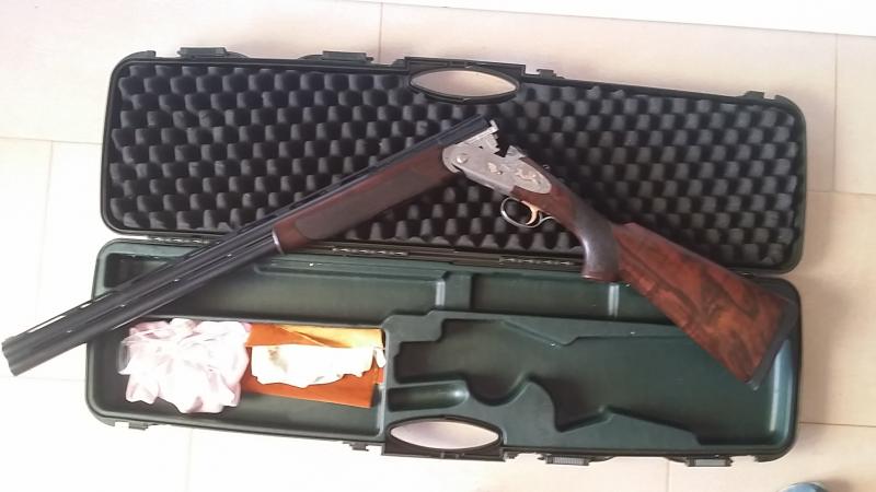 Escopeta superpuesta bettinsoli tarcisio de luxe sporting cal. 12. 5 polichokes, Maderas muy bonitas veteadas, cañones ventilados, bonitos grabados con escenas de caza. Incluye maletin original