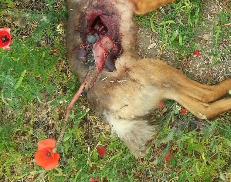 Además hay más cosas que no cuadran; el acceso es por un camino arenoso y no había rodadas de otro coche que no fuera el mío, y el pueblo más cercano estaba a 5-6 km. Por otra parte el raposo había sido arrastrado. Se veía en la beza el arrastre y la sangre típica de ello, y una persona simplemente lo agarra y ya está, No es un guarro que no queda otra que arrastrarlo. Y...porqué llevarlo a 20-25m de donde lo dejé?