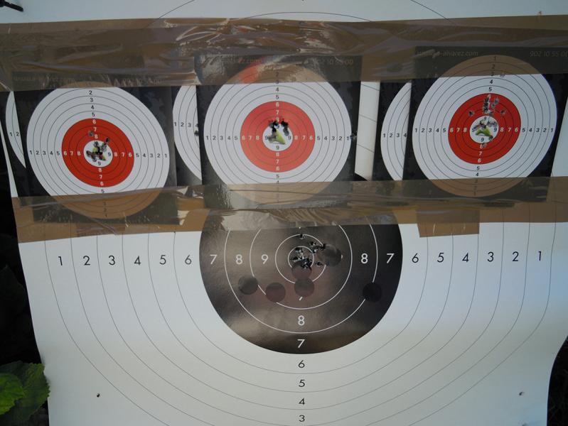 Un par de fotos. La diana esta a 12 m, y el tirador, es mi hijo de 9 años, evidentemente, tiene que tirar apoyado, pues no puede todavía con la carabina, que pesa 5 Kg, es una carabina para un adulto