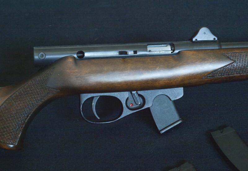 Me acabo de comprar una carabina del .22 LR fuerte, de oferta, nueva, con cuatro cargadores, semiautomática, se desmonta sin herramientas en menos de un minuto, traga balas de alta velocidad sin romperse, miras trasera de librillo regulable a 25.50,75 y 100 metros, es Rusa, el seguro además del gatillo bloquea el cierre, tres muelles recuperador, uno de ellos hace también de muelle de Aguja.
