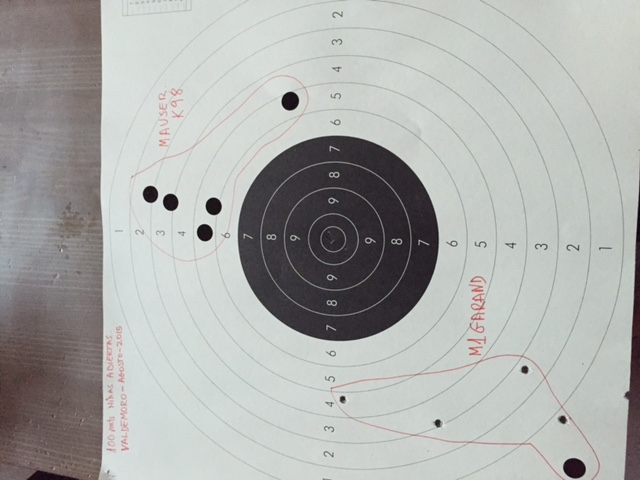 Tengo que decir que es a 100 mts con miras abiertas, no es para tirar cohetes pero claro a esa distancia no se ve ni un pimiento y el unico punto de referencia es un papelito blanco en el centro de la diana. Teniendo en cuenta que hace una hueva que no tiro con 8x57 y con 30.06 no lo veo del todo mal, quiza el Garand se ha ido a la izquierda y un poco abajo, pero es que no he podido ya regular in situ me tenia que ir de las instalaciones y no sé muy bien el mecanismo del Garand como funciona , la tirada esta con la rueda en 100 mts, aunque a lo mejor lo tenian que haber puesto a 150 mts y corregir una raya hacia la derecha en la otra rueda.