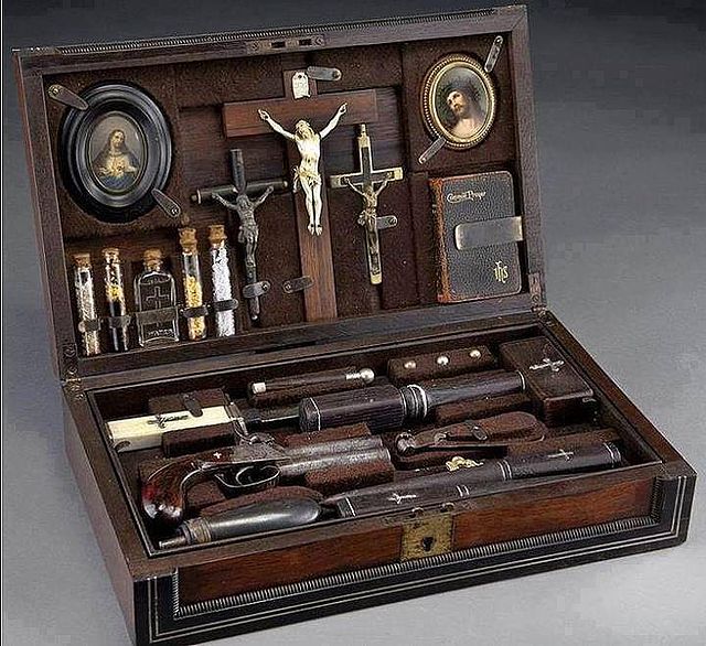 lo curioso de este maletín es que tiene una pistola de avancarga parece que de dos cañones , con su correspondiente polvorera, tres bolas, y un cuchillo, también tiene dos estaca de madera y un martillo del mismo material, aparte de todos los abalorios necesarios para la misa.