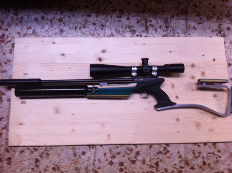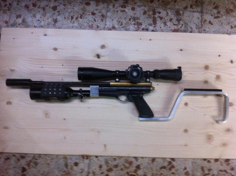 pues asi quedo la ultima crosman, cambie el deposito de 200 cc por uno de 400 cc , cambie el culatin squeleton de aluminio por una culata extensible tipo m4 con adaptador tipmman home made y asi ha quedado