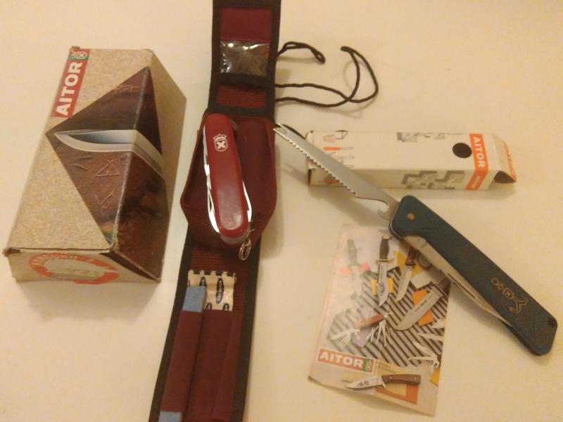 AITOR ERMUA, modelo Pescador, en su caja con su cordón fiador. Nueva. Aitor Ermua, modelo Pastor grande, madera veteada muy bonita y superrobusta, con unas cachas anchas, agarre muy cómodo,. Nueva. Y Kit de Aitor, Kanguro 2, en funda granate Aitor, para llevar en cinturon, con kit de supervivenvia y caja. Piezas completamente a estrenar. Particular. Gastos de envio, incluidos.