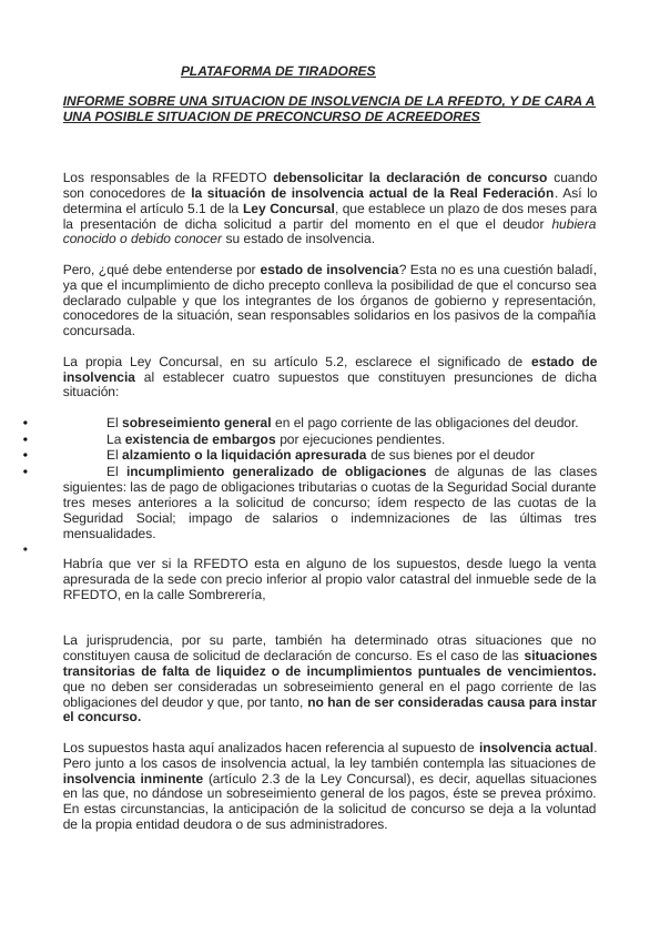 Tampoco por parte de la Asesoría Jurídica se informo debidamente de la situación real de insolvencia de la RFEDTO, que pudiera provocar en el futuro acudir a una situación de preconcurso o concurso de acreedores, en especial la situación patrimonial y los gravámenes sobre las propiedades patrimoniales, la cuenta real de acreedores a corto, medio y largo plazo, y su montante en cuanto atención de dichos pagos pendientes en tiempo y forma,. Siendo dicha información del todo necesaria para objetivar en un futuro una posible situación de concurso que podría generar en un concurso culposo, que conllevaría responsabilidad para todos los que votaron a favor de las cuentas y venta del patrimonio de la RFEDTO.