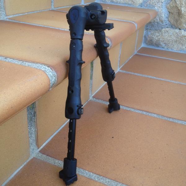 De calidad superior y adaptable al universal sistema picatinny cuenta con otro rail en la parte inferior para adaptar cualquier otro accesorio (laser, linterna...etc). Estructura de acero ligero recubierto de polímero de alta resistencia, patas abatibles independientes y extensibles con botón multiposición.