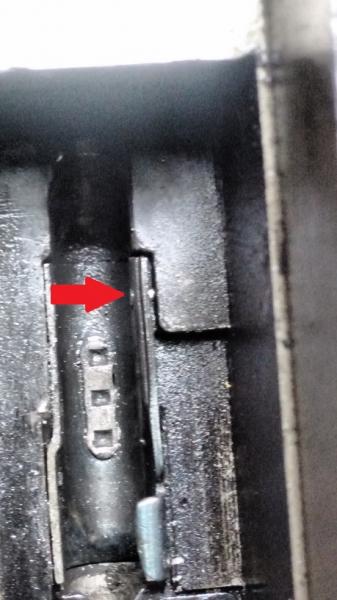 El problema está cuando el nuevo cartucho que sale se desliza por la rampa de alimentación. En ese momento el cartucho, que debería seguir encarrilado por la rampa que se ve en la imagen anterior hasta la recámara, cae por su peso al fondo de la caja de mecanismos del disparador por no quedar bien encarada la punta hacia la recámara.