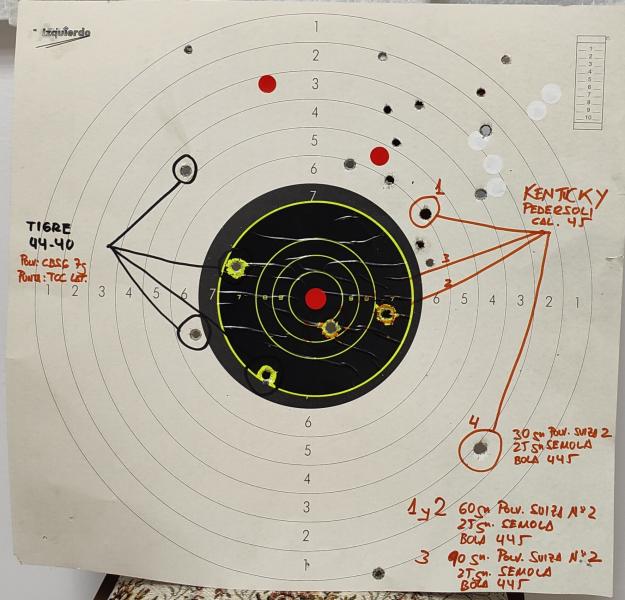 La primera diana està al reves, el primer tiro, alto y a la derecha, el segundo entró en el negro, ambos con 60g, el tercero rompió la linea del 10, con 90g de polvora suiza N° 2.