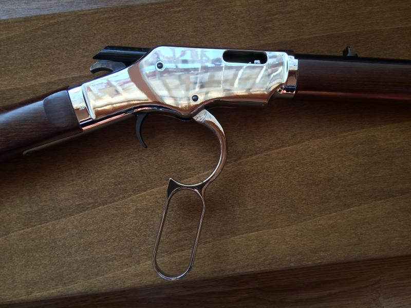 Carabina calibre . 22LR de palanca, marca Uberti Silverboy. Réplica de Winchester 1873 y guiada en AE. Tengo certificado del BOPE con catalogación de arma antigua. Comprada nueva hace 4 años como capricho, no ha tirado más que 2 cajas de balas. Muy precisa y bien hecha, una gozada disparar con ella. Todo en perfecto estado: maderas, metales, mecanismos y cañón. Cargador tubular de 15 balas.
