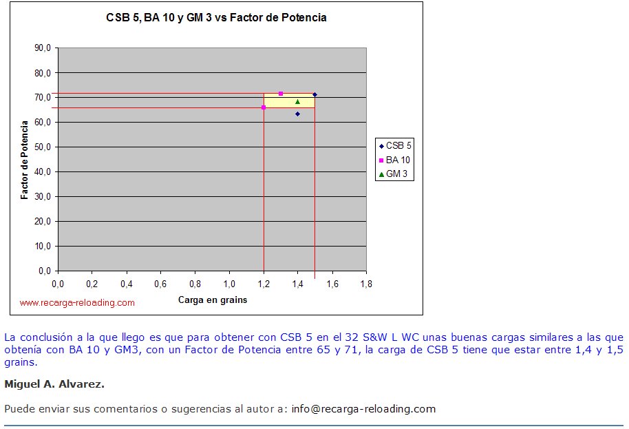 Para el 32 WC con punta de 100 grains, estoy utilizando la CSB5 y le pongo 1,5 grains de CSB5. Esta carga es una carga "picante", equivalente a la de 1,3 grains de BA10 (la equivalencia la deduzco al obtener valores similares de velocidad, energía y factor). Para cargas similares a la de 1,2 grains de BA10, uso 1,4 grains de CSB5.