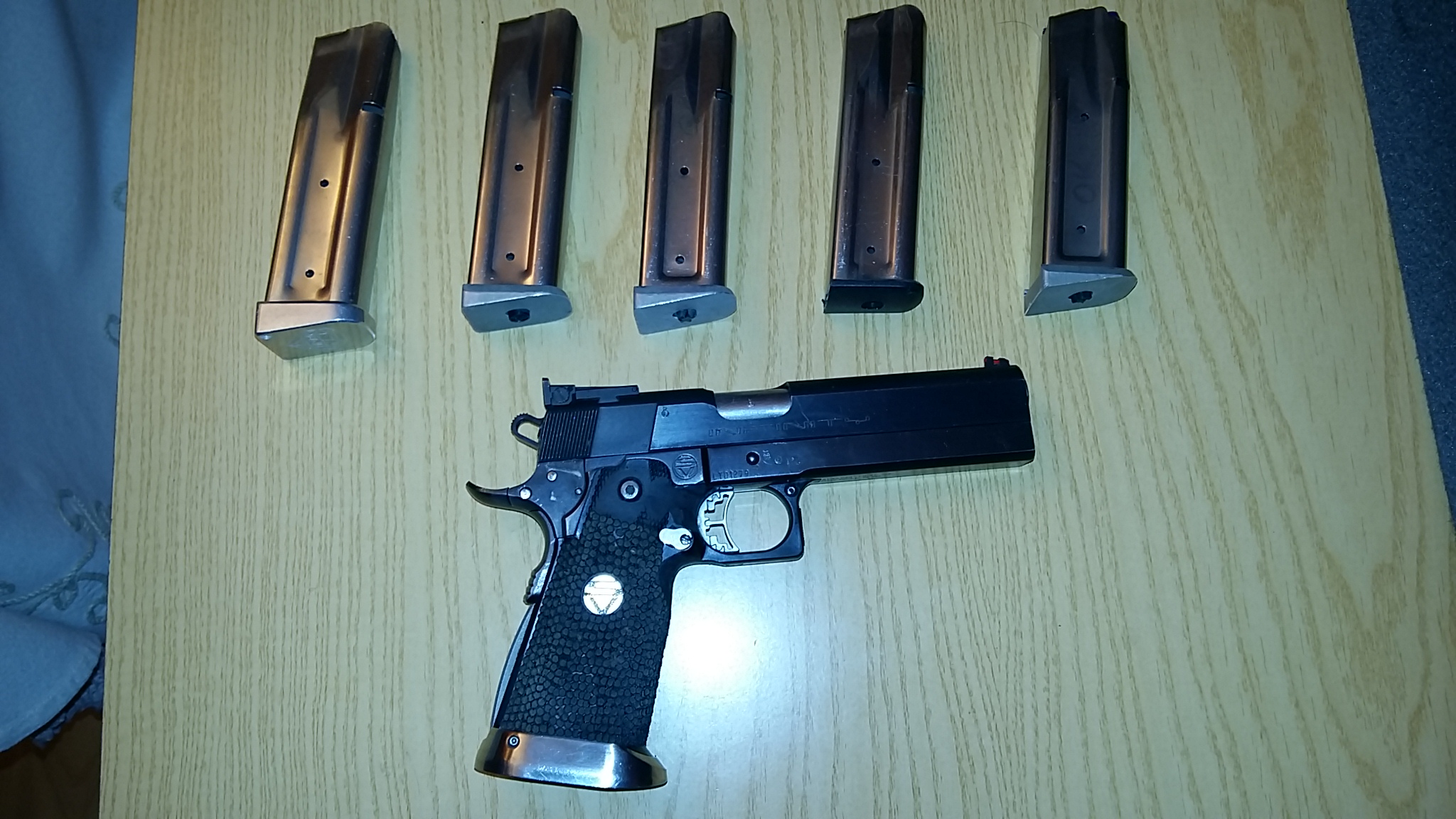La pistola infinity. Esta en buen estado. Ha tirado solo municion recargada y muy flojita. El dueño tenia unos 80 años. Necesita cambiarse la empuñadura, aunque lleva funcionando en ese estado muchos años. (Se pasó metiendole lima y le hizo un agujero). Incluye 4 cagadores infinity, un cargador sps. Tres portacargadores y funda HS. Precio 1350€. A la pistola hay que añadirle un kit del 40 que no teniamos controlado. Compuesto de cañon, bechface, llave allen, estractora,dos cargadores notmales y dos mas largos. El arma se quedaria en 1600€.