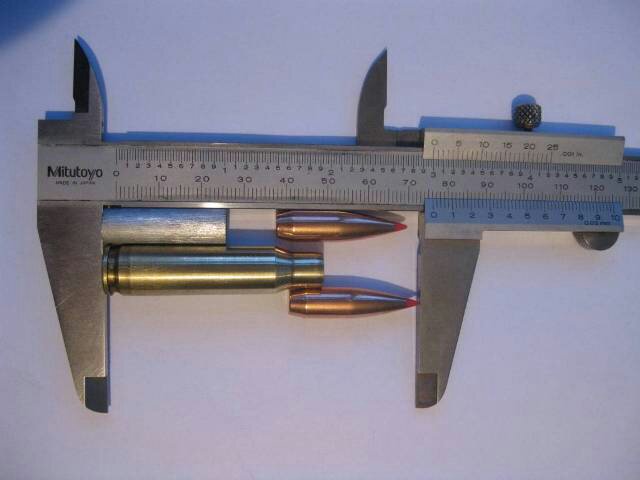 Above, the .308 Winchester cartridge and 168 grain A-Max. The bottom projectile is set to the max COAL touching the rifling. But if you look at the bullet shank, you will see that there is not enough shank in the case for optimum concentricity. The top projectile is set to the preferred length for concentricity. The optimum length is 71mm (2.795").