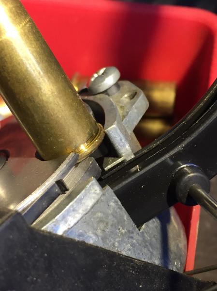 Hace años que compré una Lee Pro 1000 que he utilizado muy poco. Ahora estoy intentando cargar .44-40 para lo que adquirí el shellplate adecuado (# 14), el empujador de vainas para calibres mayores y el tobogán con empistonador de fulminantes large. Una vez las vainas en los tubos, alimenta correctamente la primera estación (recalibrado-desempistonado), así como la segunda (empistonado-abocardado-dosificación de pólvora), pero al pasar a la tercera se atranca porque choca con el borde de la vaina. Adjunto una foto que he tomado por si alguien puede ayudarme.