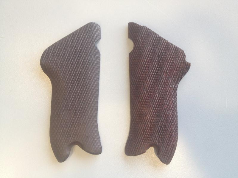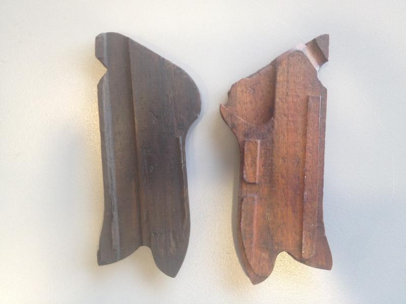 Se trata de un juego de cachas originales, derecha e izquierda, pero que no son pareja entre sí, es decir, que por el tono de la madera, desgaste de los picados y marcajes en la cara interior, deduzco que han pertenecido a armas diferentes.