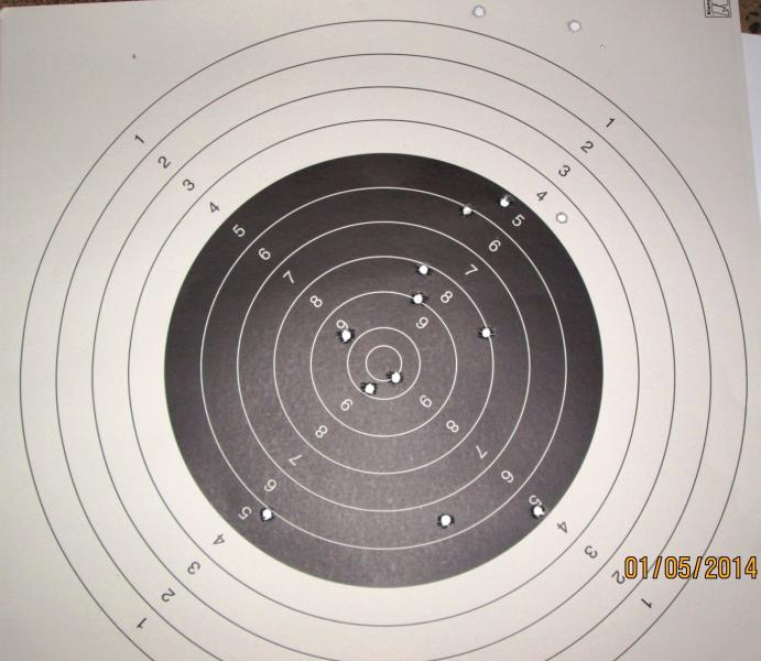 Carga la de siempre y tirando tumbado. He efectuado el primer disparo y no he podido localizar con el visor el impacto , me he supuesto que he dado en el negro pero no se donde. Vista la diana me supongo que el primero es el que se ha llevado por delante la cinta aislante del 4 situado a las diez. Diana reciclada, hay que ahorrar. El segundo si lo he visto, es uno de los cincos de la izquierda. Efectuo dos tiros mas que tambien impactan en el cinco de la izquierday decido mover el tunel. El proximo ya se coloca en el siete pero aun en la izquierda y decido ir a vuscar las gafas de leer que tengo en el coche pues muevo el tunel a ojo. sin gafas no veo nada. Ya con las gafas miro la libreta de notas para ver la posicion que tenia apuntada para el tunel y veo que aun esta dos lineas fuera del lugar que tenia anotado. Rectifico la posicion y ya no lo vuelvo a mover. Los siguientes ocho disparos creo que han quedado bastante bien agrupados, el siete a las doce un poco mas alto pero en la misma linea de los demas. Estos fusiles de cañon largo son la leche