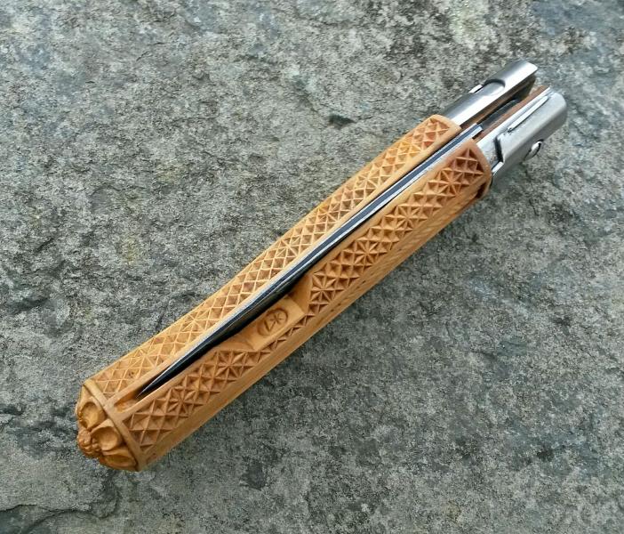 Navaja estilo francés "Le mar jack" con seguro, en acero mukti-layered steel suminagshi de 22 capas en boj tallada por Javier Lopez, precio 230 euros con envio incluido RETIRADA