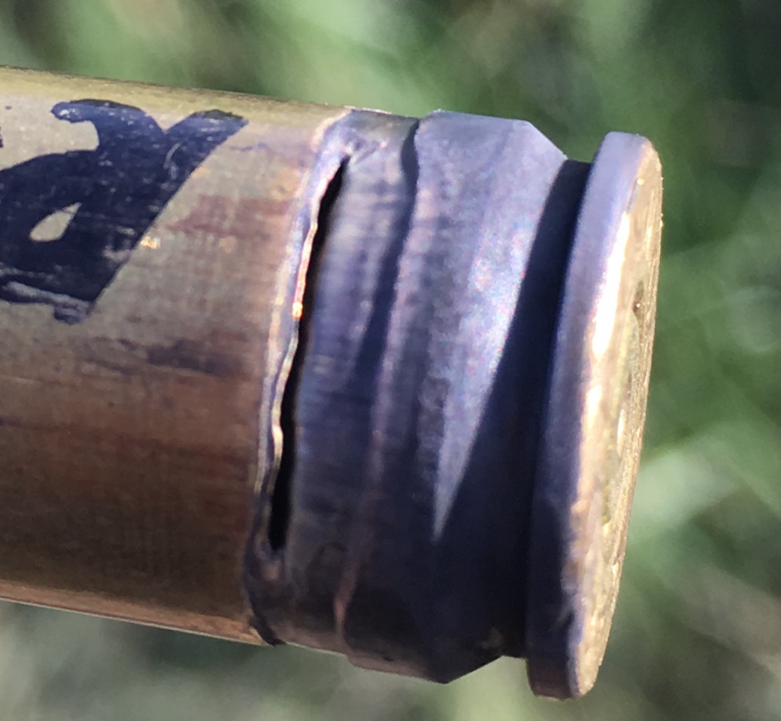 Primer disparo, todo parece correcto, la lectura de crono un poco baja, 923ms y al mirar al rifle todavía sin abrir, observo humillo salir del cerrojo y cargador. Al abrir me encuentro la vaina así.