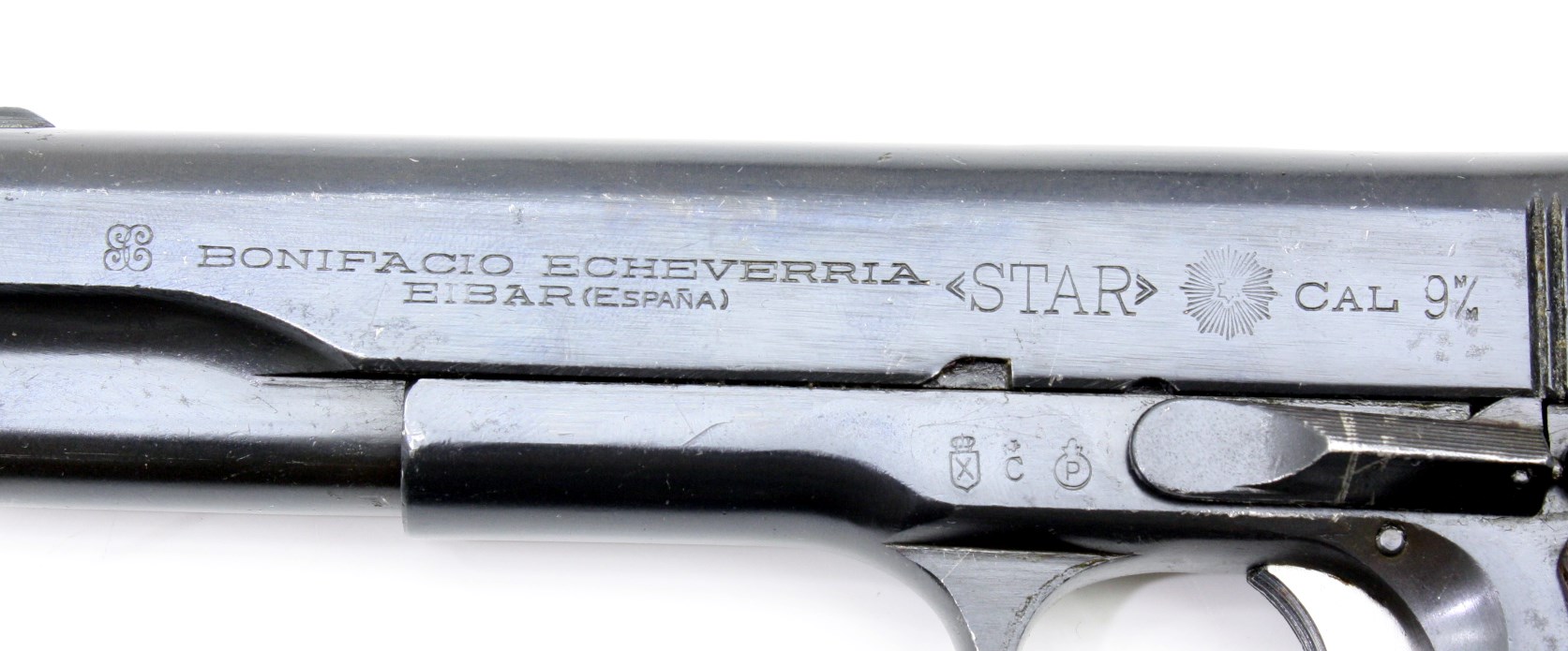 Edito, por olvido : El arma, evidentemente, es tambien una pistola STAR, en este caso del modelo conocido como Militar 1940, con escasas diferencias sobre el 1931 anterior , y corresponde según el punzón de pase por el BOPE a 1941, primer año en que estuvo en vigor el nuevo emblema. El calibre en este caso es el 9 Parabellum, casi con seguridad por haber sido recamarada a este con vistas a la exportación tras ser "desmovilizada", aunque en origen debió de ser el 9 largo de reglamento en aquellos años
