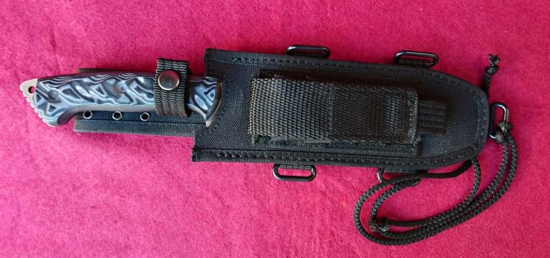 Empuñadura con cachas de micarta. Huecos para colocar cordon fiador. Funda de cordura Tactica que incluye un bolsillo superior donde se puede alojar complementos de campo o para el pedernal o firesteel.