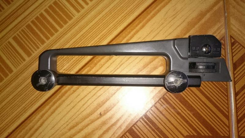 Lo segundo es de airsoft, es el asa con mira de m16, creo que se llama m4, se puede colocar en carril y picatinni