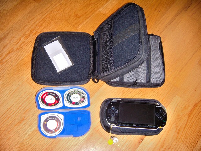 - 1 Funda portatil con multiples bolsillos para el transporte de juegos, sujección para PSP y bolsillo de red para cascos.