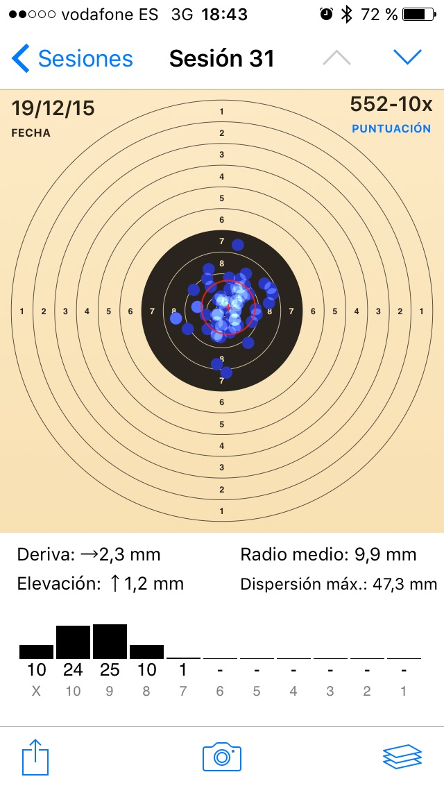 La app se llama TargetScan y la uso en el iphone. Le sacas una foto a cada blanco (10 tiros) y el programa calcula los puntos, radio medio, comparación con tiradas anteriores, etc.
