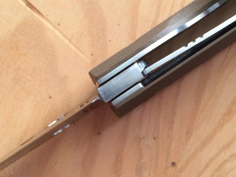 La hoja mide 89 mm.de longitud y tiene una sección de 4,5 mm. y esta fabricada en acero S 30 V . El mango tiene forros de acero aligerados y cachas de G-10 de color marrón (coyote brown según el fabricante) texturizados y sección romboidal, que le proporciona un tacto y un agarre excepcional.