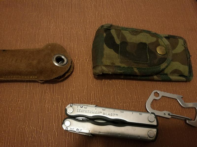 Navaja Multiusos Leatherman modelo Blast provista con 16 funciones. Funda de piel con herramienta abrebotellas y otra funda verde mimetizada. Todo usado en buen estado.