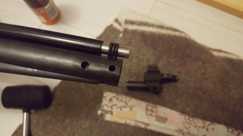 - Resoplaba bastante por la tórica del empujador del balín, creo que necesita una de mayor diámetro exterior pero del mismo diámetro de hilo. A falta de una mayor, calcé el fondo de la ranura del empujador donde se aloja con una tirilla de cinta aislante, unas dos vueltas. Se corrigió algo, lo suficiente para comprobar que resoplaba por algún sitio mas.