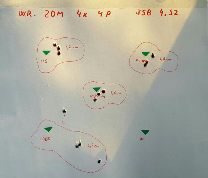 En esta primera diana vemos 4 moderadores y en el centro sin moderador. El lobo no me funciona.... a la vista esta. Creo que aun no esta correctamente alineado el cañon y que las arandelas que lleva dentro son muy estrechas. El moderador de abajo a la derecha ni siquiera entra en diana. Creo que tropieza el balin a lo bestia. En el centro tiro sin moderador. Agrupacion de 16 mm a 20m con 4 bombeos y jsb 4.52. Los dos de arriba son iguales solo que una tiene la salida y tripas de mayor diametro. Agrupaciones de 1.2 y 1.6 cm.
