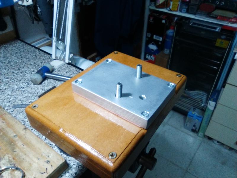 Es similar a la que vende (y bien vendida) Lyman. La única dificultad que tiene este invento es encontrar este tipo de perfil de aluminio, por que la fabricación es bien sencilla, solo se trata de hacer los taladros pertinentes para instalar la recalibradora, entre la mesa y la placa hay que poner un cartón/fibra de vidrio que haga de aislante.