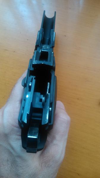 Es el modelo sin curvatura en la empuñadura y con miras en u. Guía retroceso metálica.