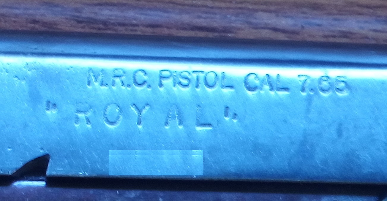 Ademas la leyenda de la corredera es parcialmente diferente. En vez de la habitual leyenda "Automatic pistol cal 7.65", esta dice "M.R.C. Pistol Cal 7.65".