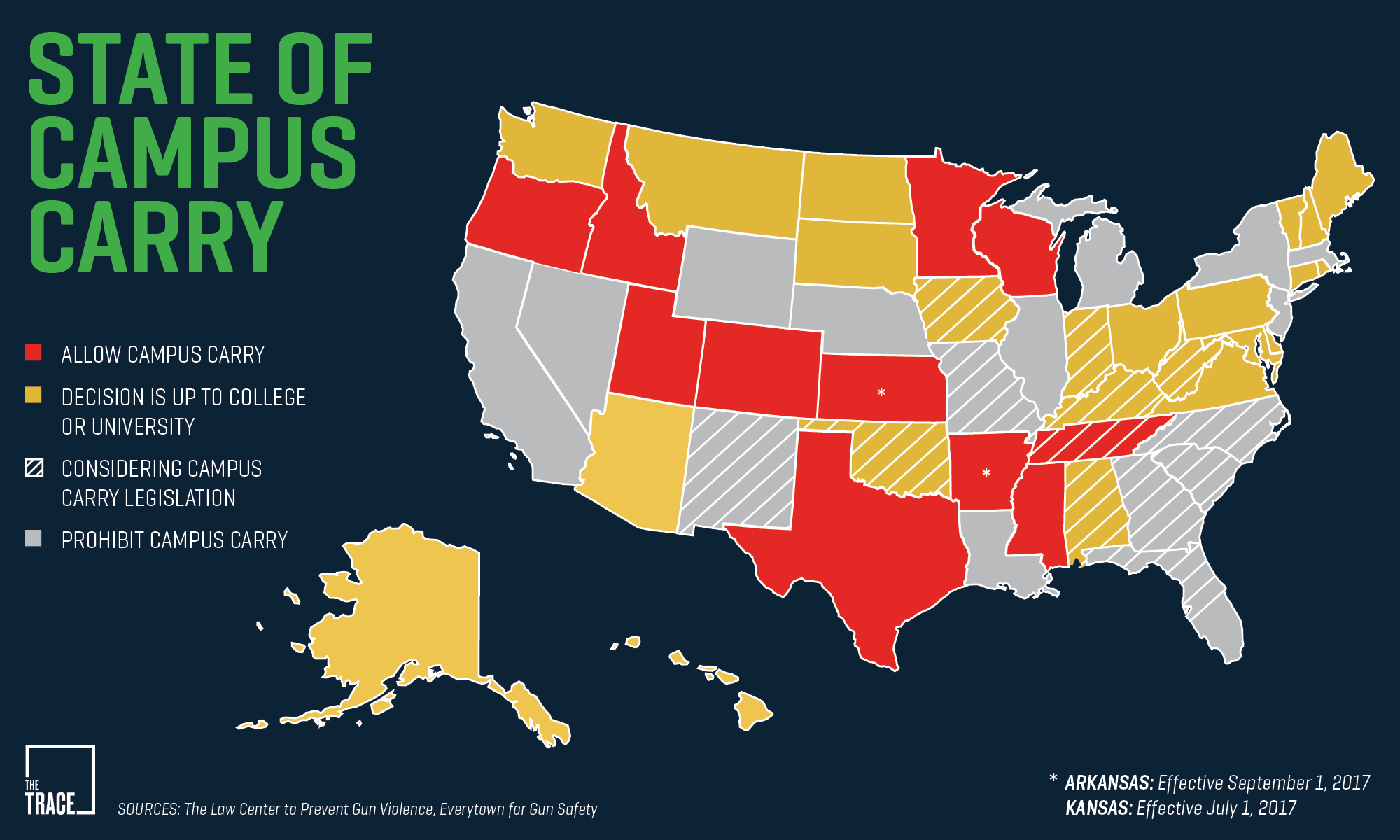 Pues si, como veis, aqui en los USA tenemos algo que se llama Campus Carry, una ley que nos permite a los universitarios ir armados a la universidad. Aunque cambia en cada estado. Ahi va un mapa en el que se puede ver que estados son mas permisivos y cuales mas restrictivos. Texas como siempre, entre los mas permisivos, yehaaaaaaaa!!! :ypist: :ypist: :ypist: si esque tengo un ojo para elegir.... :mrgreen: