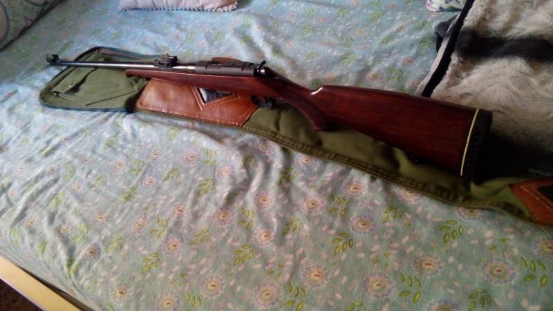 Va dotada de un cargador de cinco cartuchos y una funda hecha a medida de cuero y lona con un bolsillo lateral muy útil para portar documentación,cartuchos,cerrojo,etc...