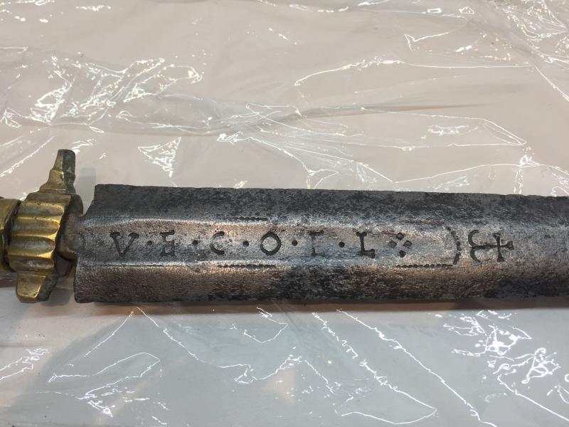 En cuanto al momento en que se adaptó la hoja a esa guarnición, es imposible saberlo. Pudo hacerse perfectamente en época, para reutilizar una espada en mal estado, o pudo hacerlo un coleccionista en algún momento posterior.