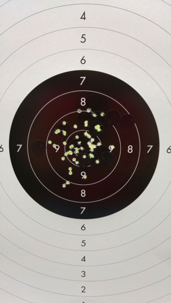 Aquí pongo unas dianas de la hermana de las 952 y 5906PPC la SW Targetchampion que va muy fina también con un disparador buenísimo, lo peor que tiene a mi gusto son las cachas muy gorditas por su cargador de gran capacidad(15).La municion es recargada con 4graims de CSB1-B.