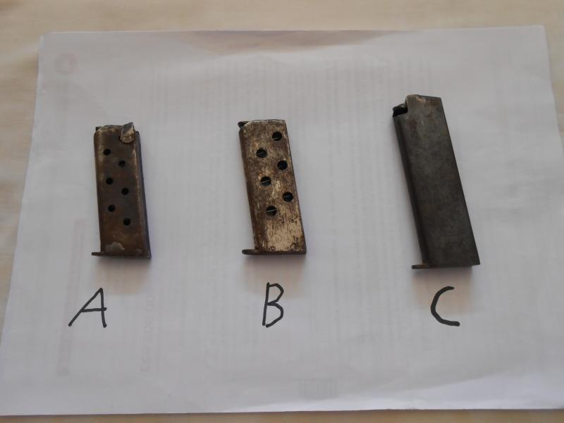 saludos:pongo a la venta estos cargadores que paso a describir;cargador A ,6,35 que tiene la particularidad de que lleva la espulsora incorporada 8 cartuchos de capacidad y medidas largo 74,5 ancho 24,8 y grueso 9,2 cargador B ,7,65 6 cartuchos de capacidad largo 75 ancho 27 y grueso 10,6 ,cargador C 9 corto capacidad 6 cartuchos largo 94 ancho 27 grueso 113, este creo que es de la llama modelo dos, si alguien me puede orientar de que arma son lo agradedco ,cualquiera de ellos lo cambio por cargador de Venus del 6,35 arma tipo eibar,el de llama tambien lo cambio por cargador llama tres el mismo pero con la base desmontable.precio 25 euros portes incluidos cada uno.