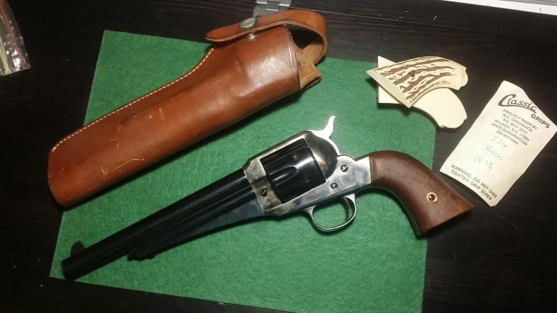 Con todo el dolor de mi corazón, y debido al cambio de normativa de nuestra querida Españistán, pongo a la venta mi Remington 1875 de Uberti. En calibre 44-40 y guiado en AE. Se puede pasar a F o a AER. El revolver ha pegado exactamente 12 tiros con nitro, ninguno con pólvora negra. Es decir que está nuevo. Le ligé las cachas para mejor agarre, aunque no lo usara para disparar. Incluyo cachas imitación marfil fabricadas en resina en EEUU y funda de cuero para los modelos 1875/1873. El arma está en Madrid. Pido 500 euros por el lote.